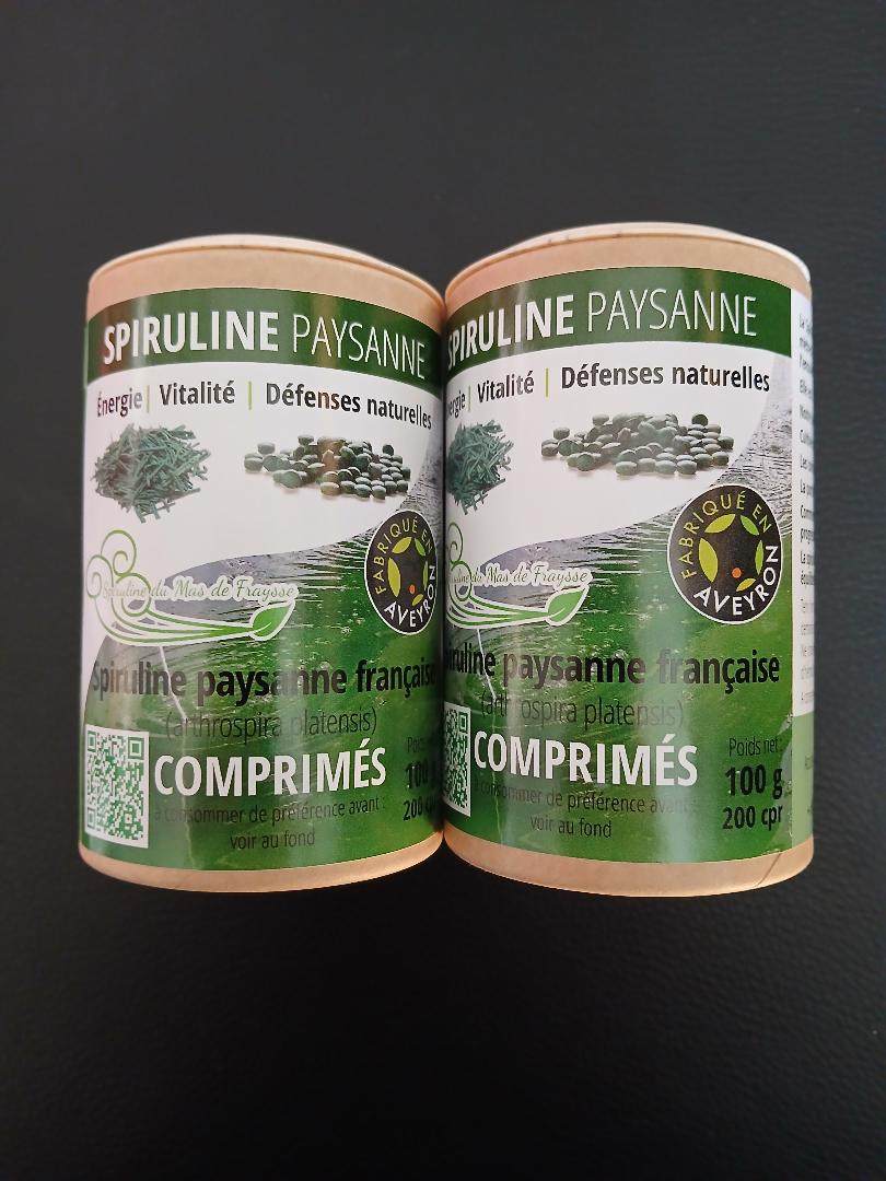 La spiruline est une algue verte cultivée, récoltée, séchée et conditionnée dans la ferme familiale du Mas-de-Fraysse. en Aveyron. Elle Les comprimés sont à 100% pur et sans aucun liant ni agent de compaction.